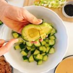 Voeg er groentjes naar keuze aan toe. Ik heb het nu simpel gehouden met edamame boontjes, komkommer, lente ui en avocado.